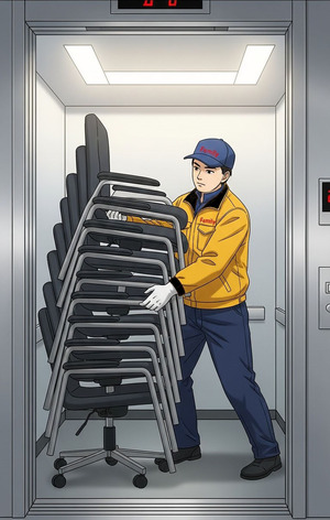 椅子は軽量だが、キャスター付きのものが多く、動きやすいため、エレベーター内での配置を工夫しながら積み込んだ。
