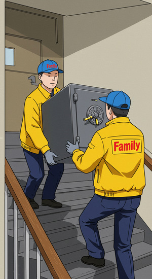 相棒が頷き、金庫を少し傾けるようにしてゆっくりと階段を降り始める。